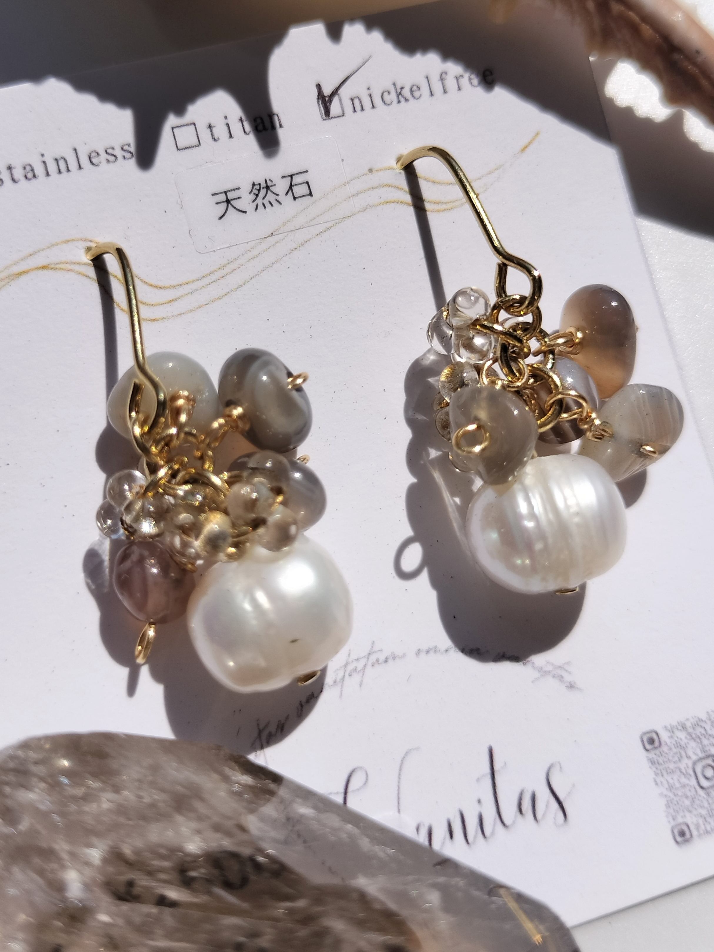 こちらは丸みのあるアゲートを、ワイヤーを使って一つずつ繋いで、淡水パールを飾り付けました。
