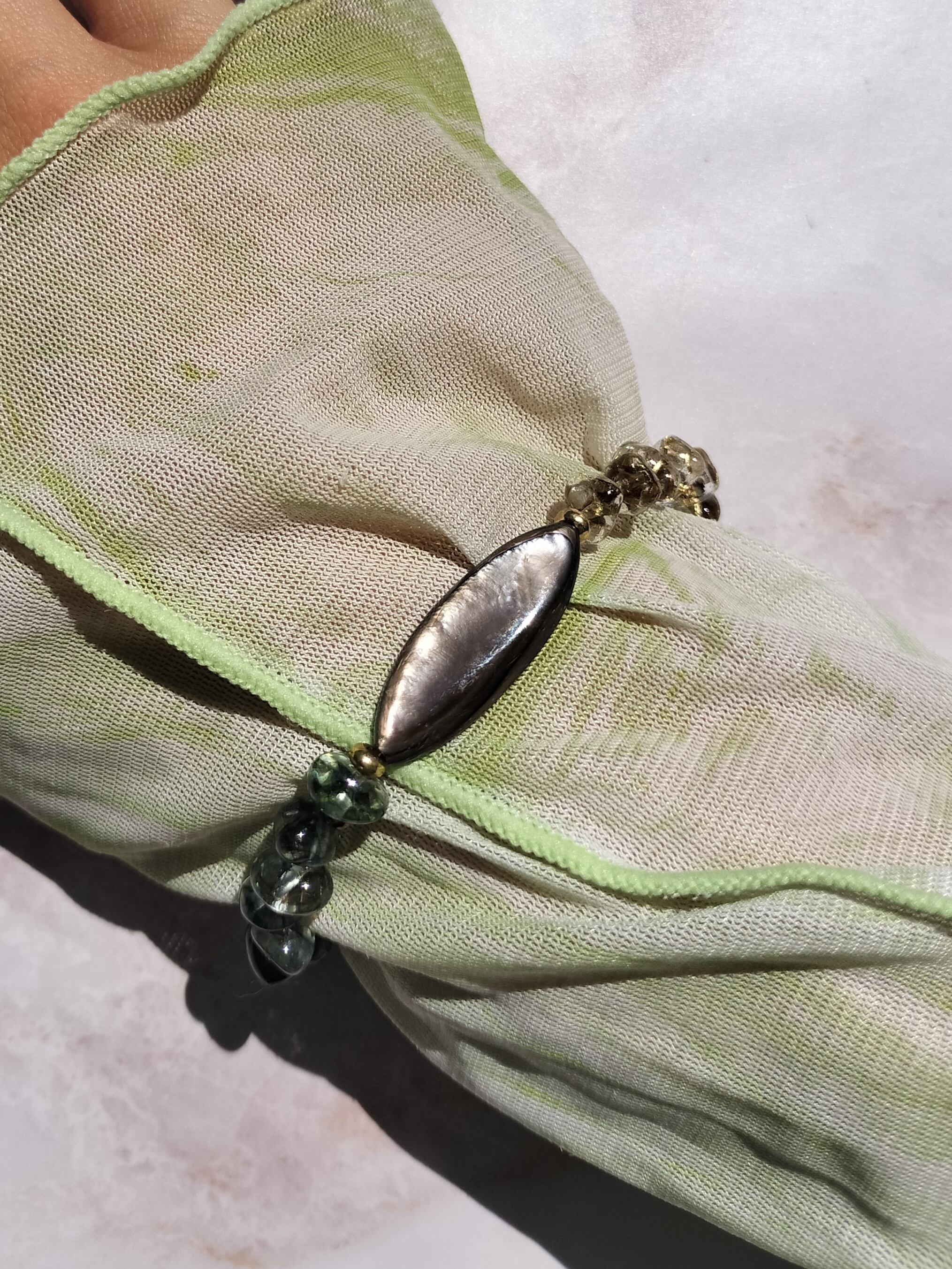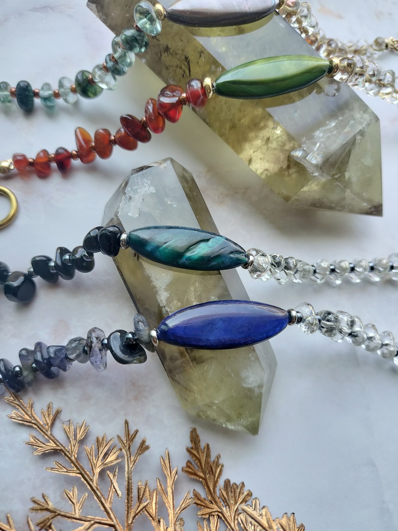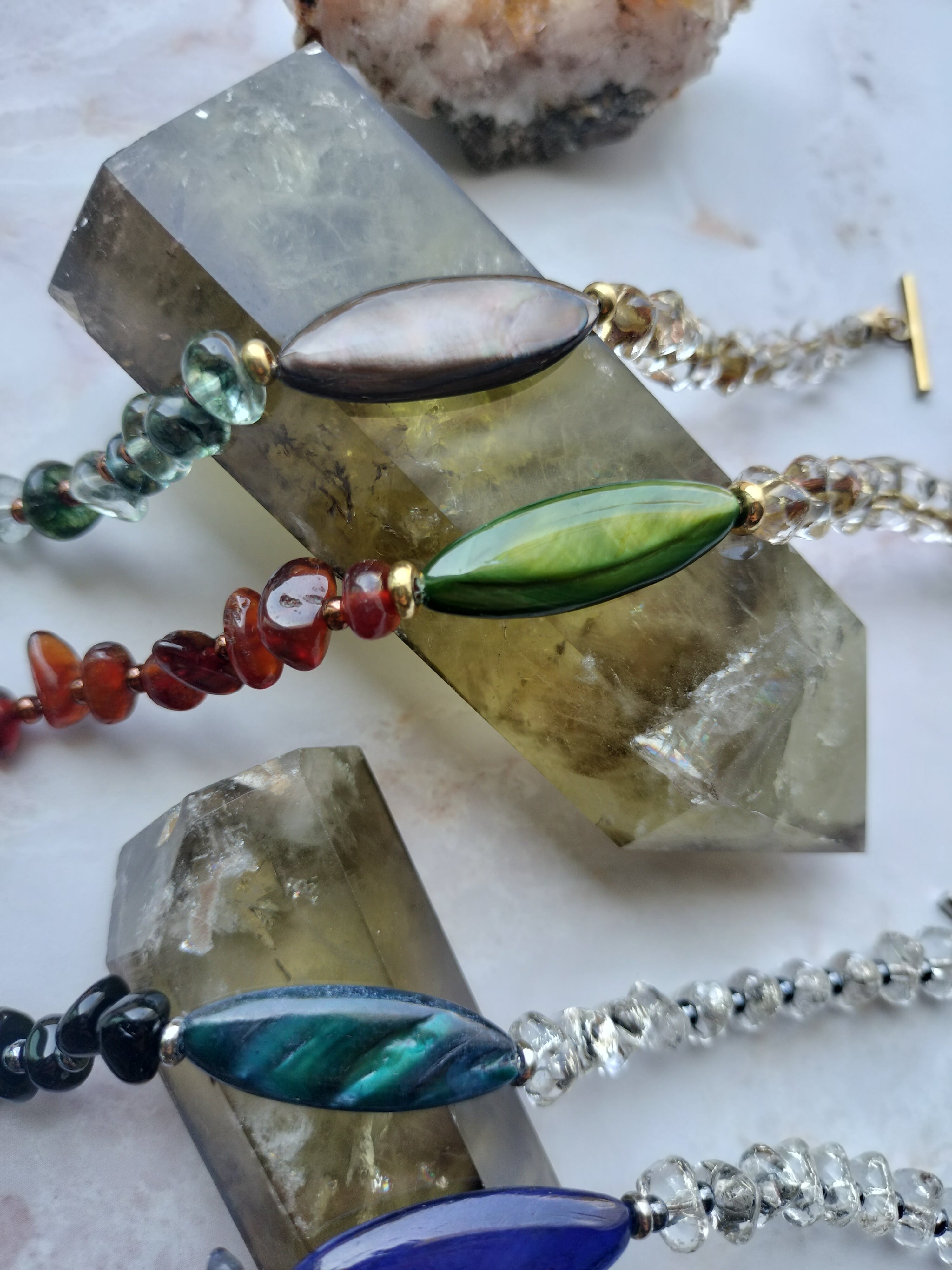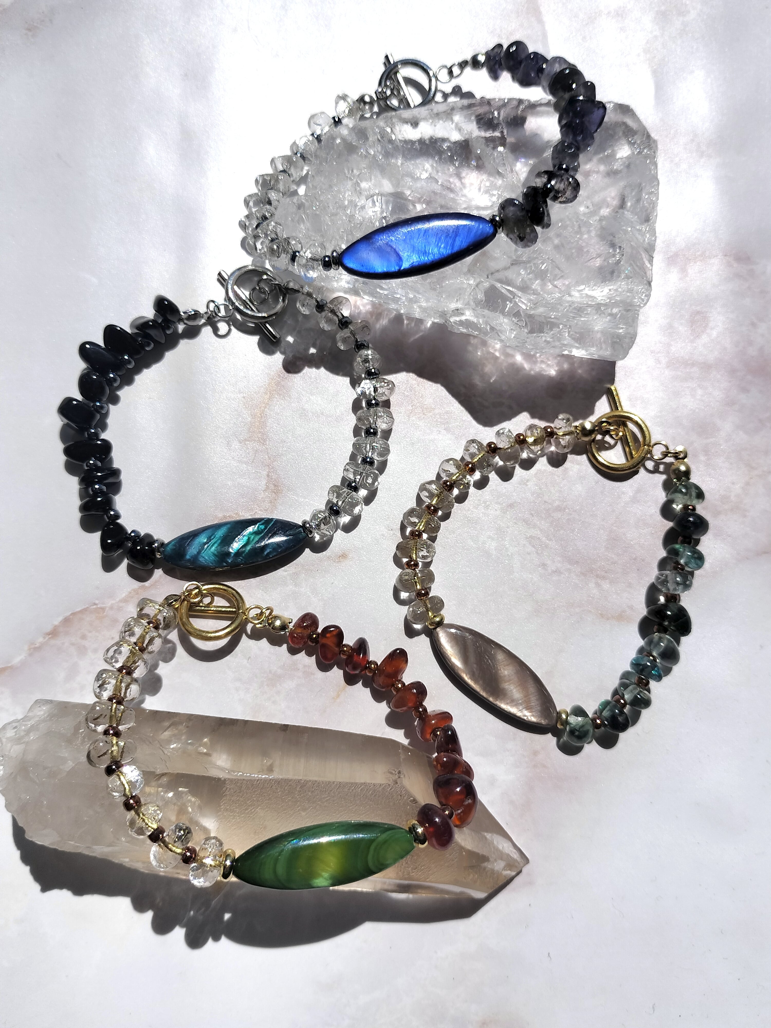 艶の美しい「シェル」をアクセントに、「チェコガラスビーズ」とナチュラルなカットの「天然石ビーズ」を左右に配しました。
