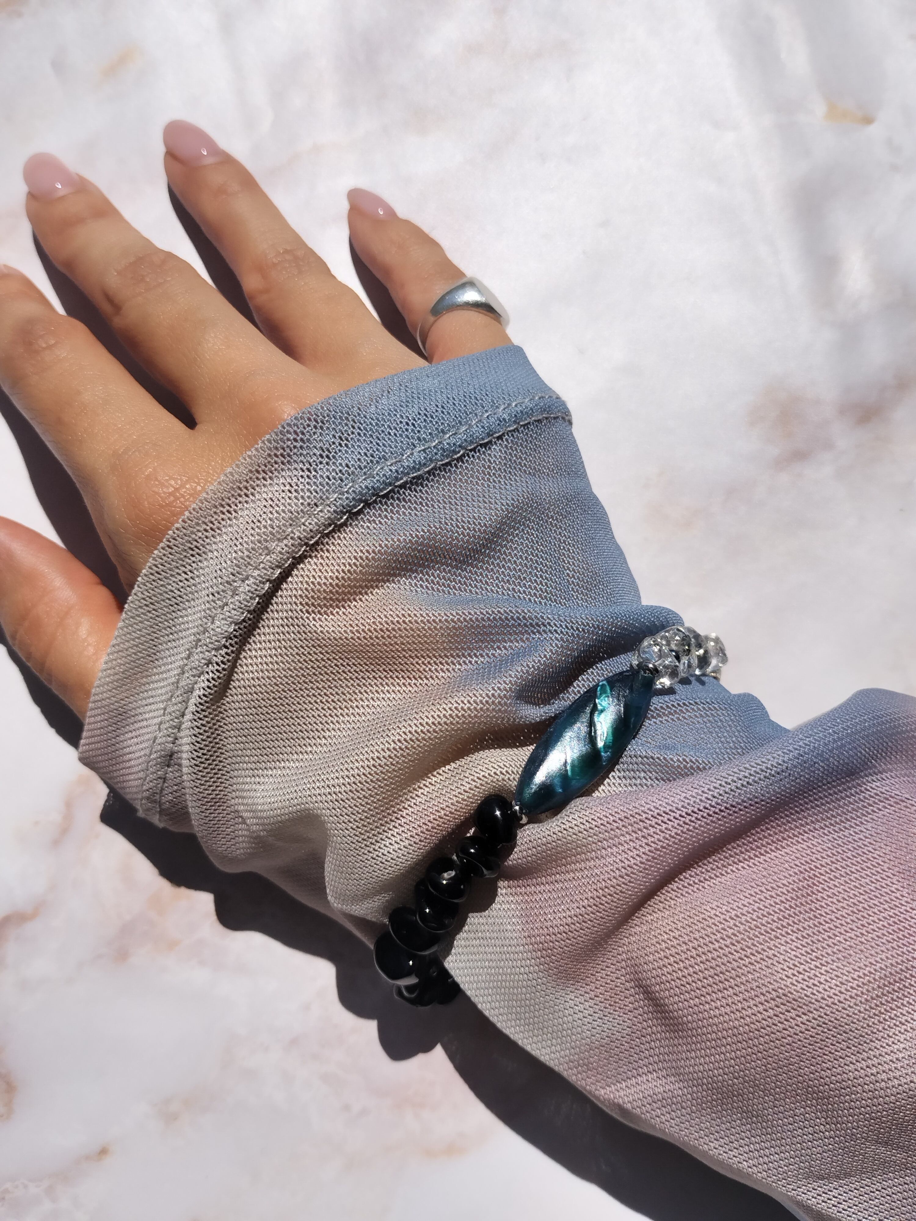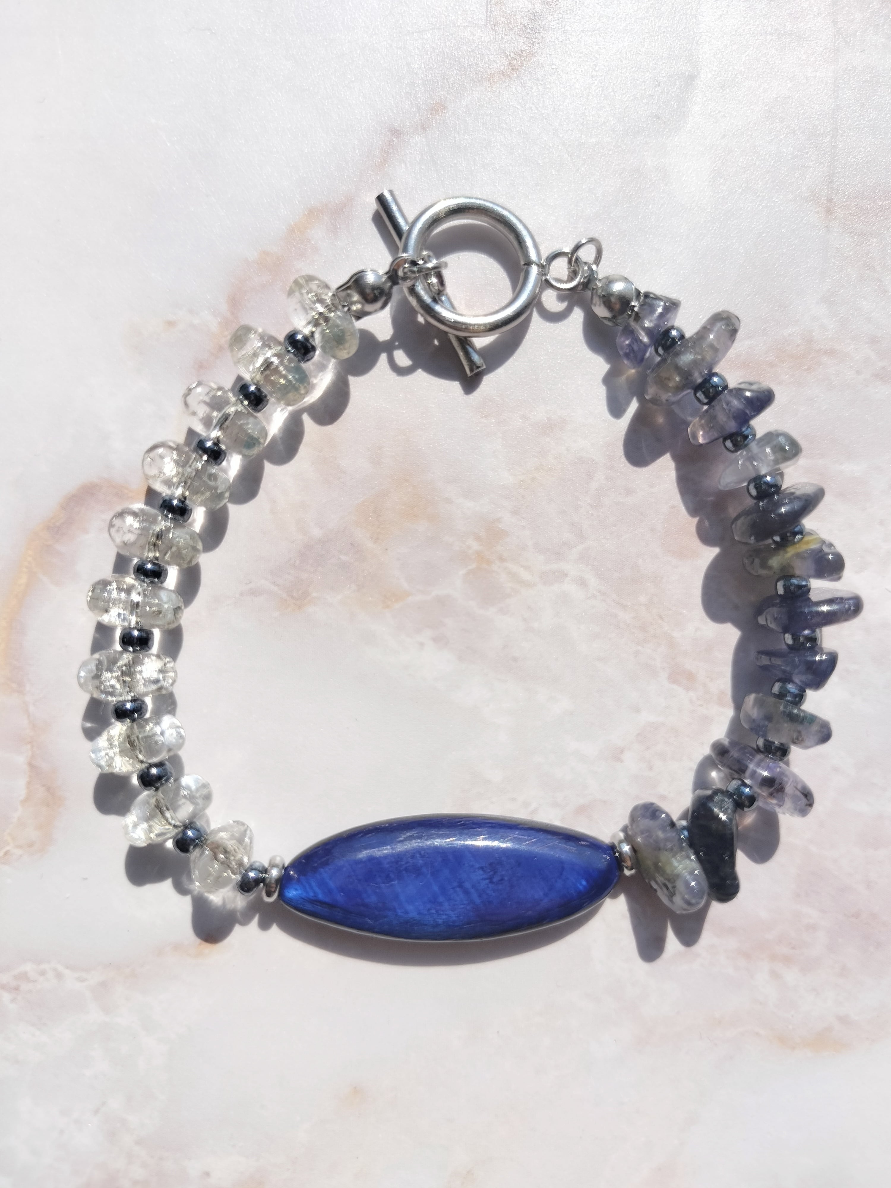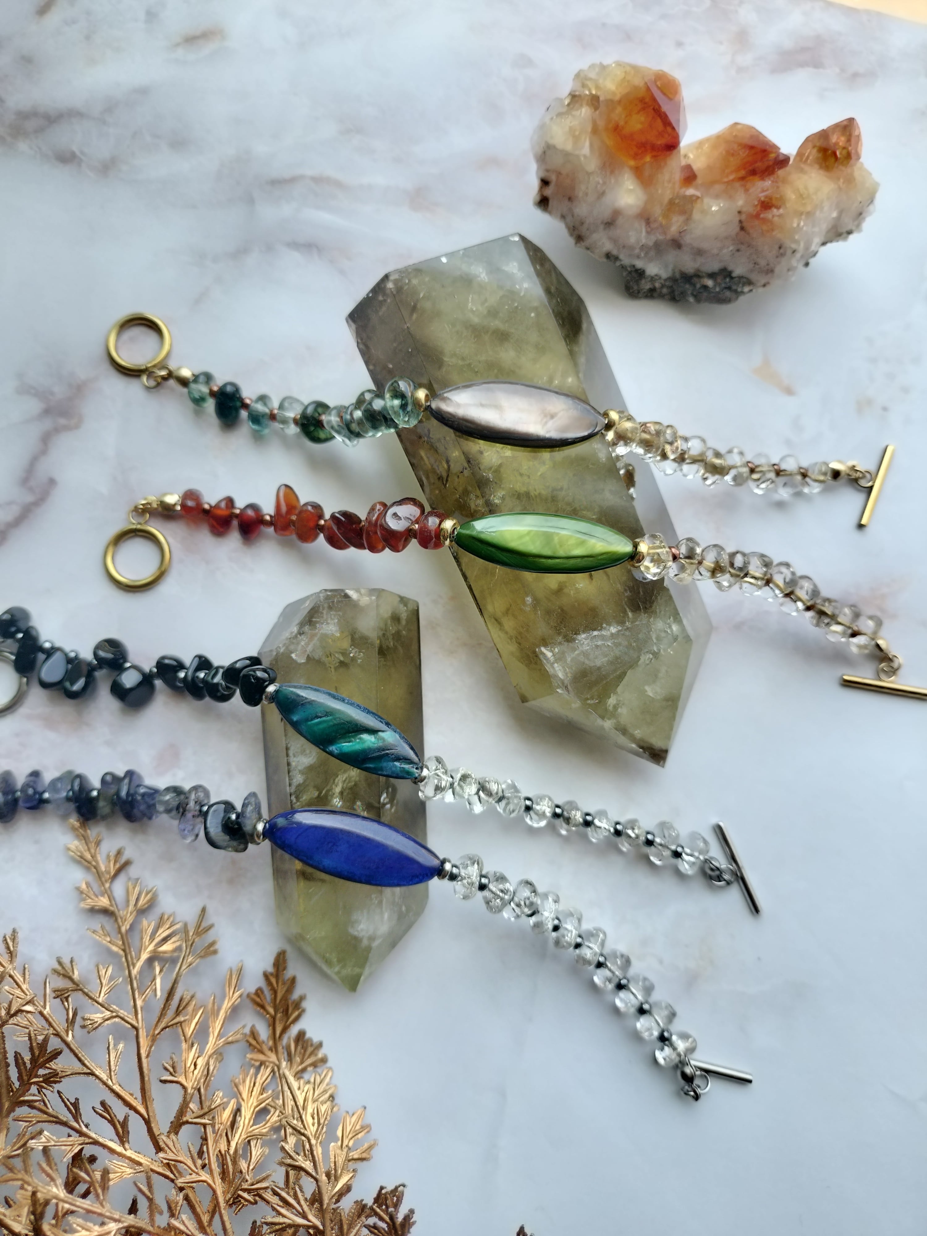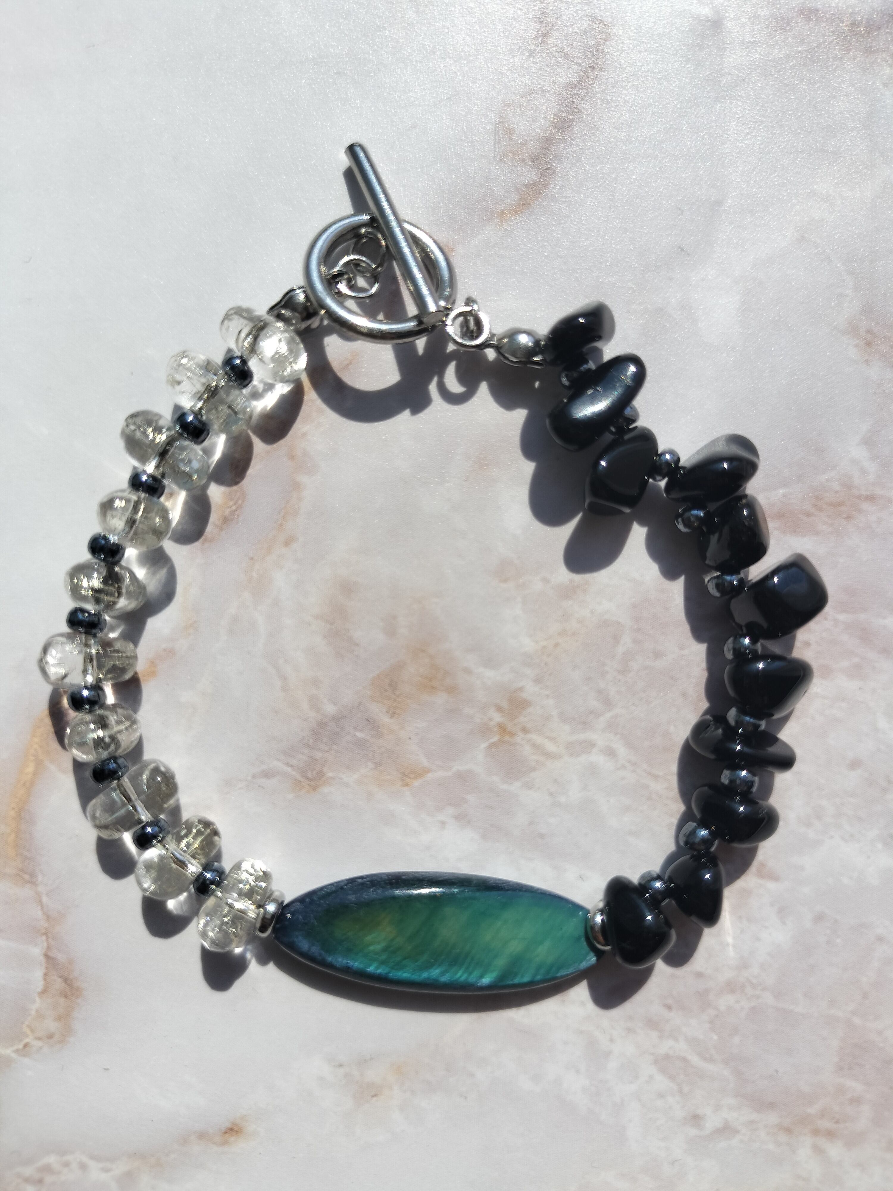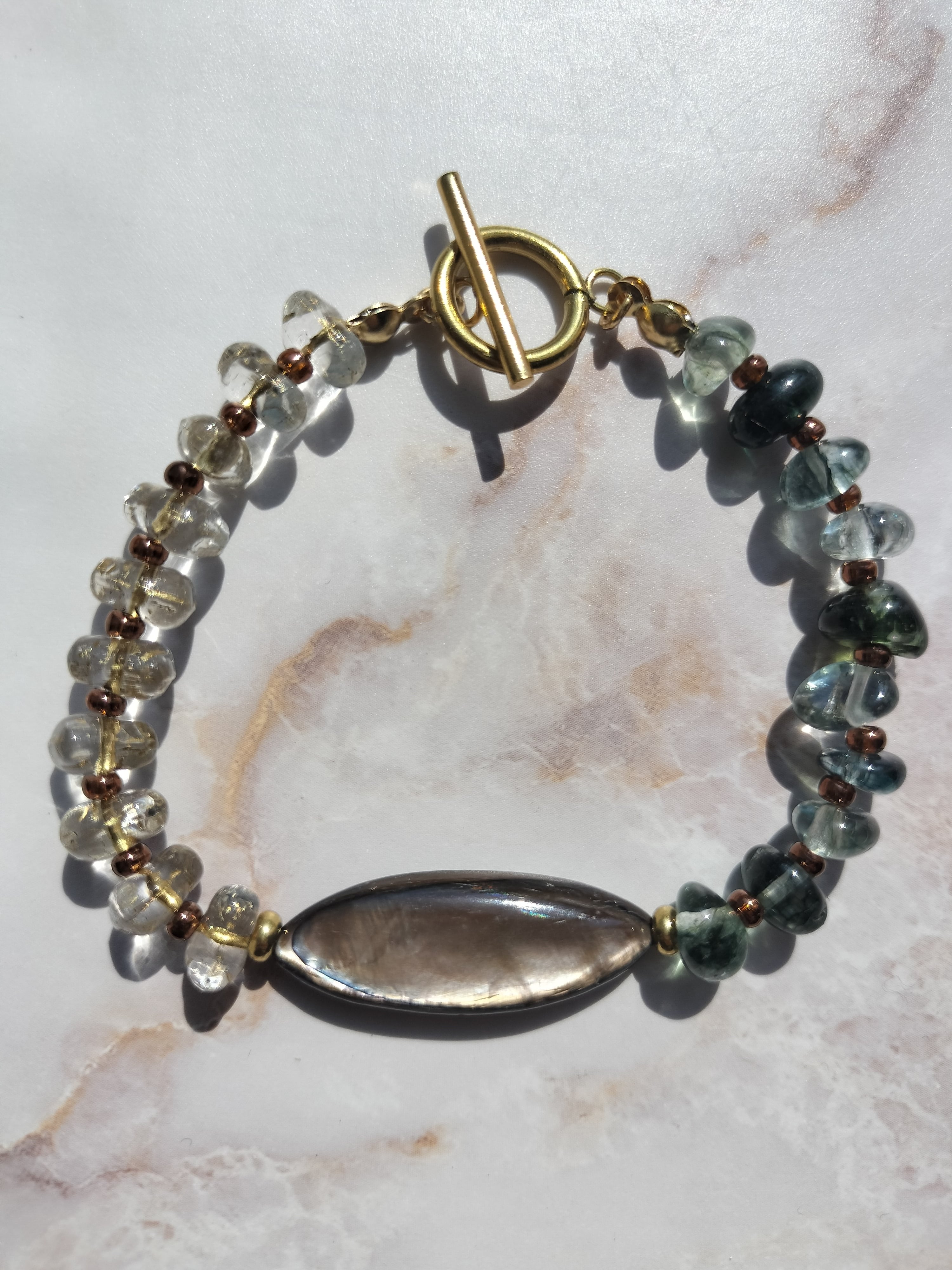 艶の美しい「シェル」をアクセントに、「チェコガラスビーズ」とナチュラルなカットの「天然石ビーズ」を左右に配しました。