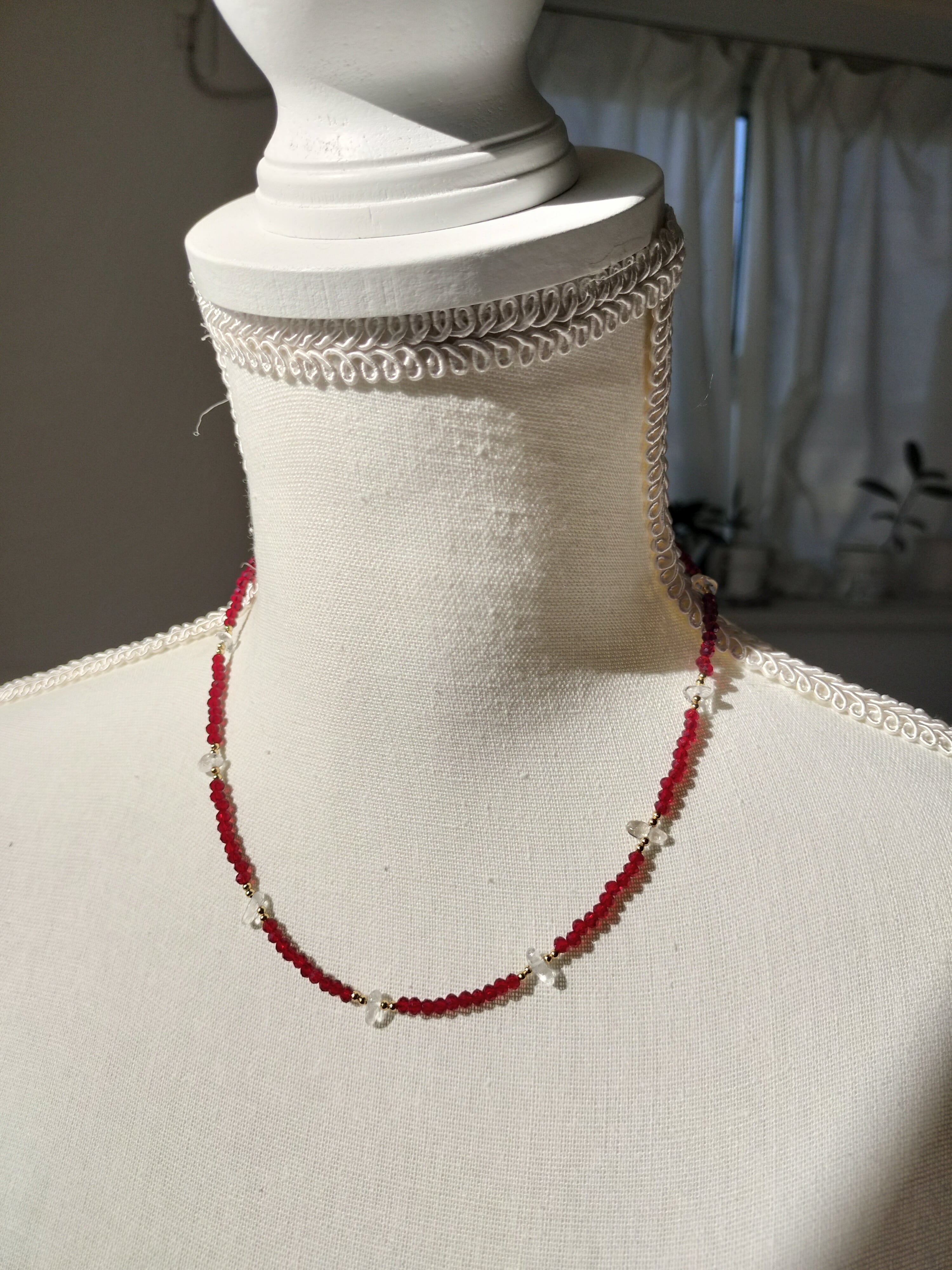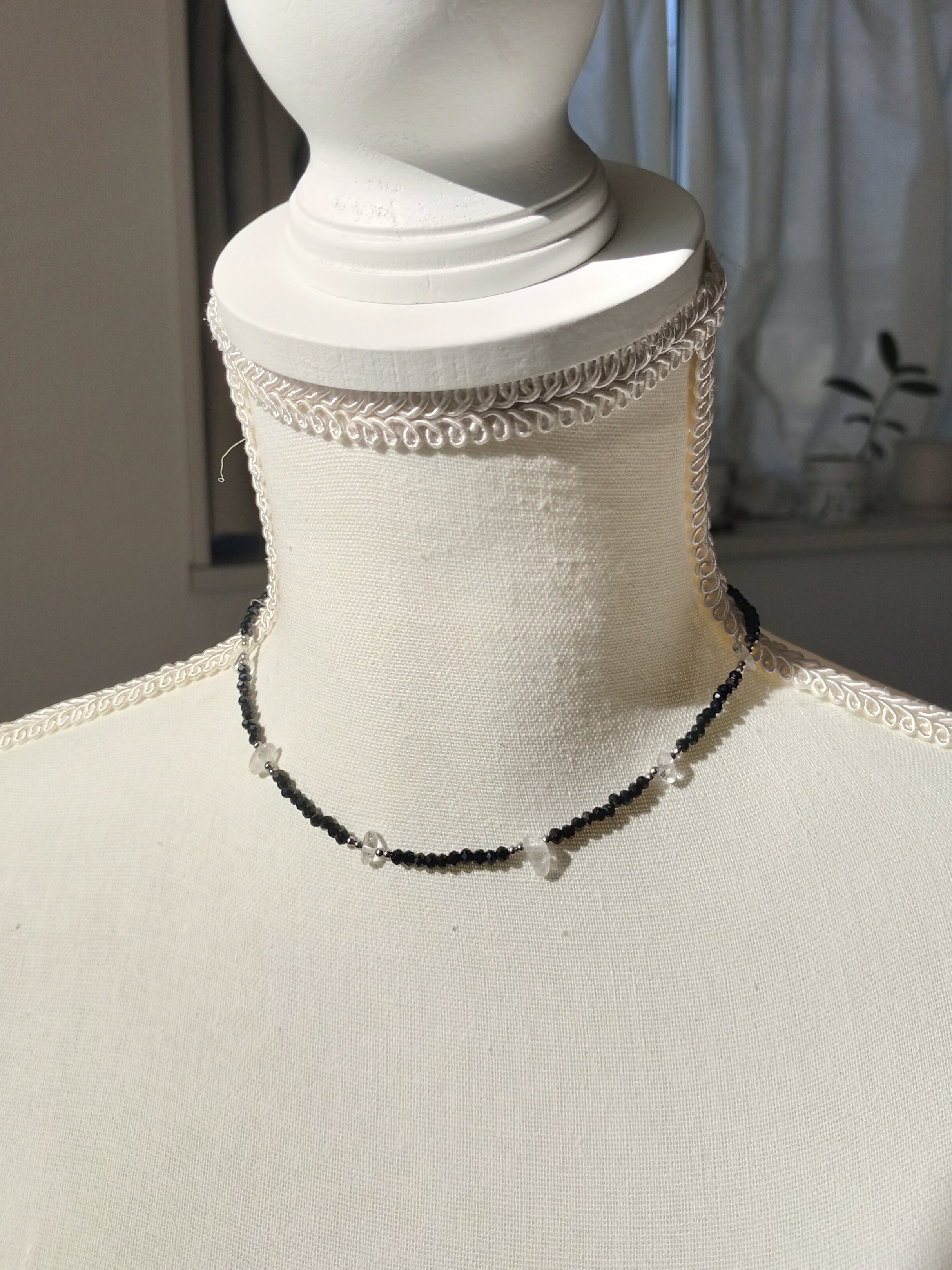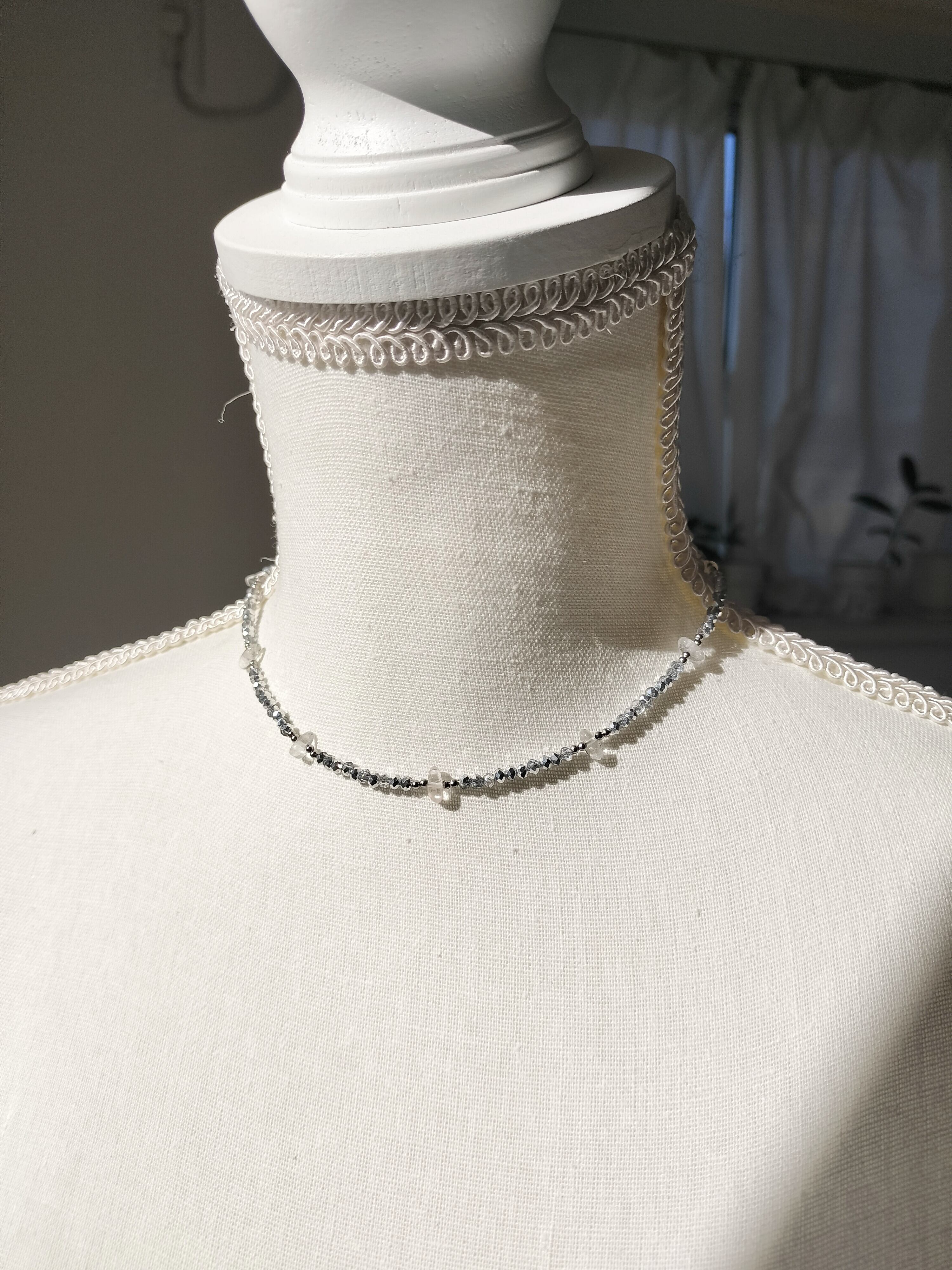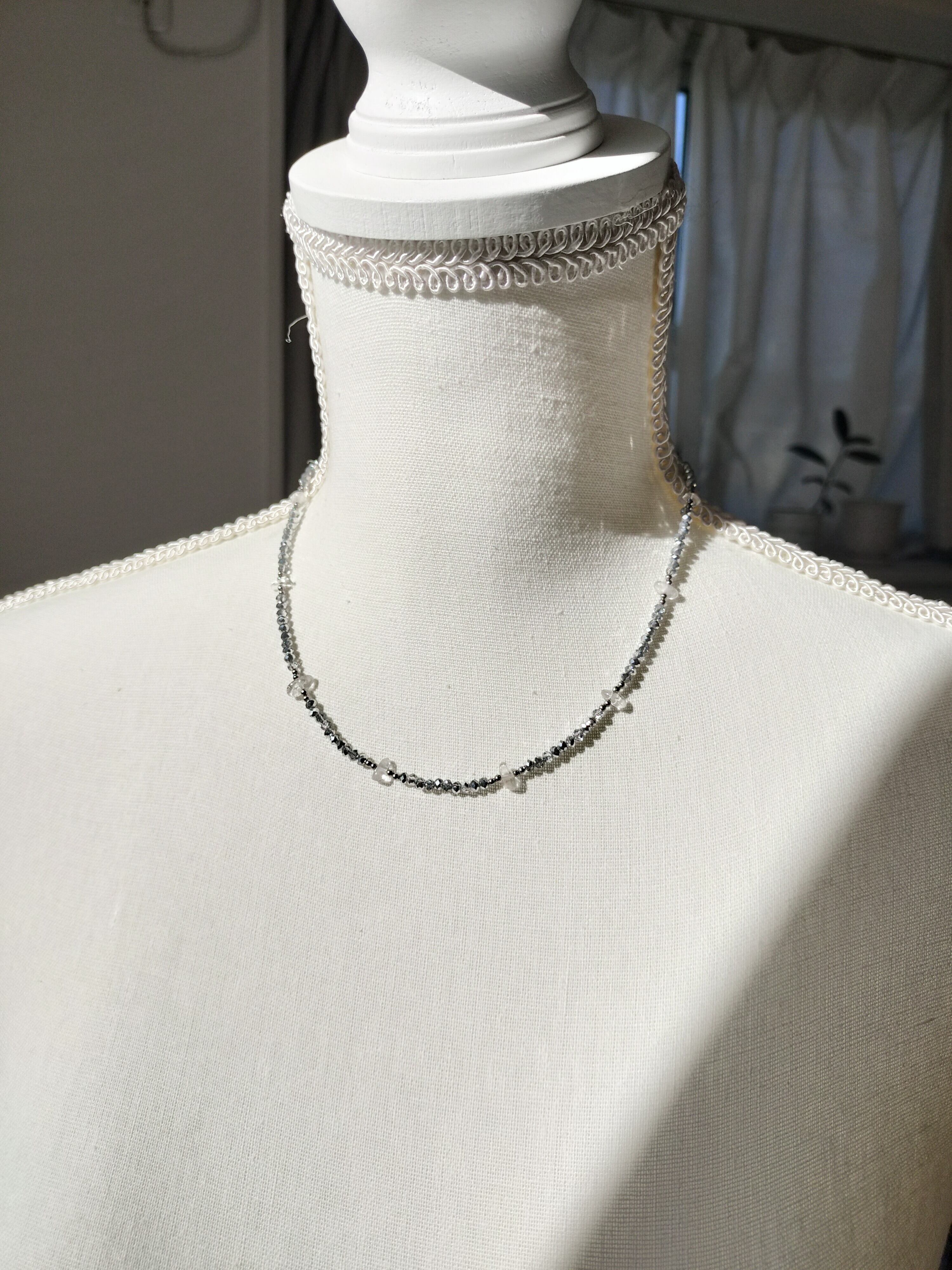 今回はコスメフロアを見ている女性をイメージして、きらめきや艶感、女性らしいラインを引き立てるショートネックレスを制作しました。