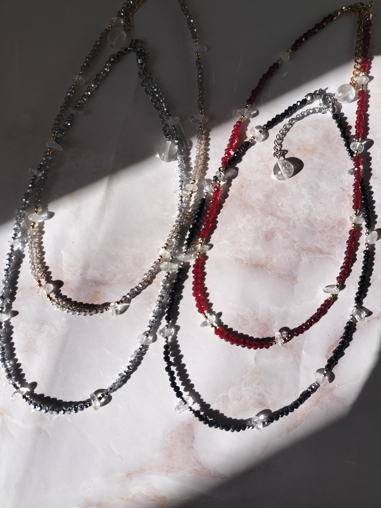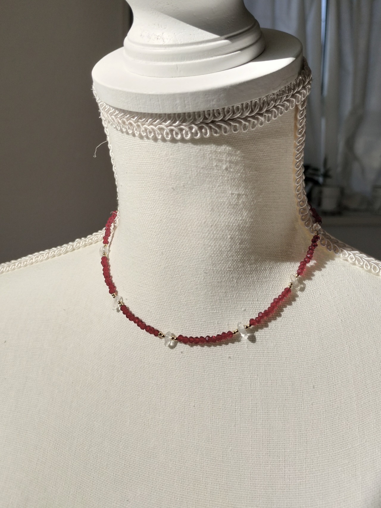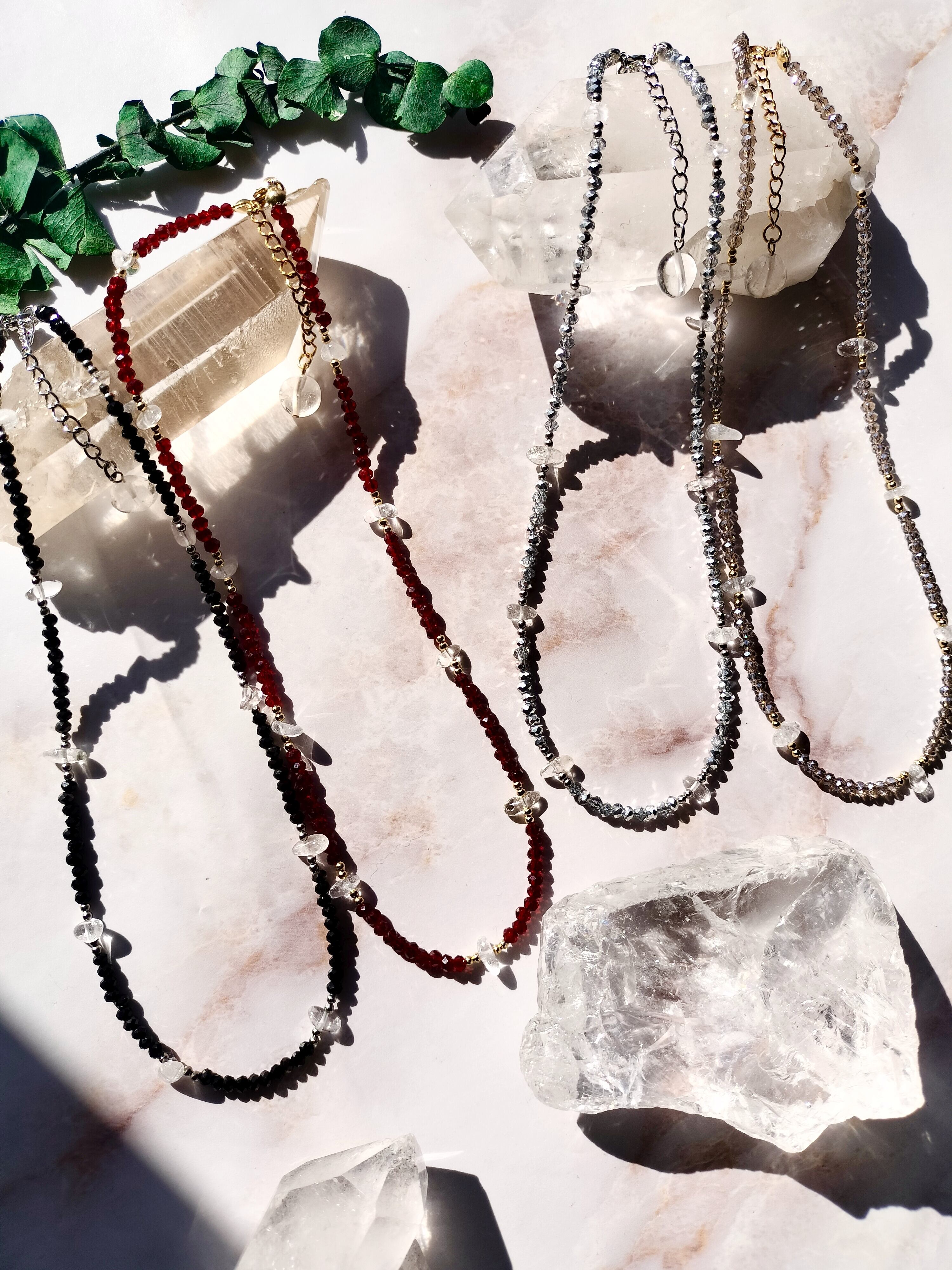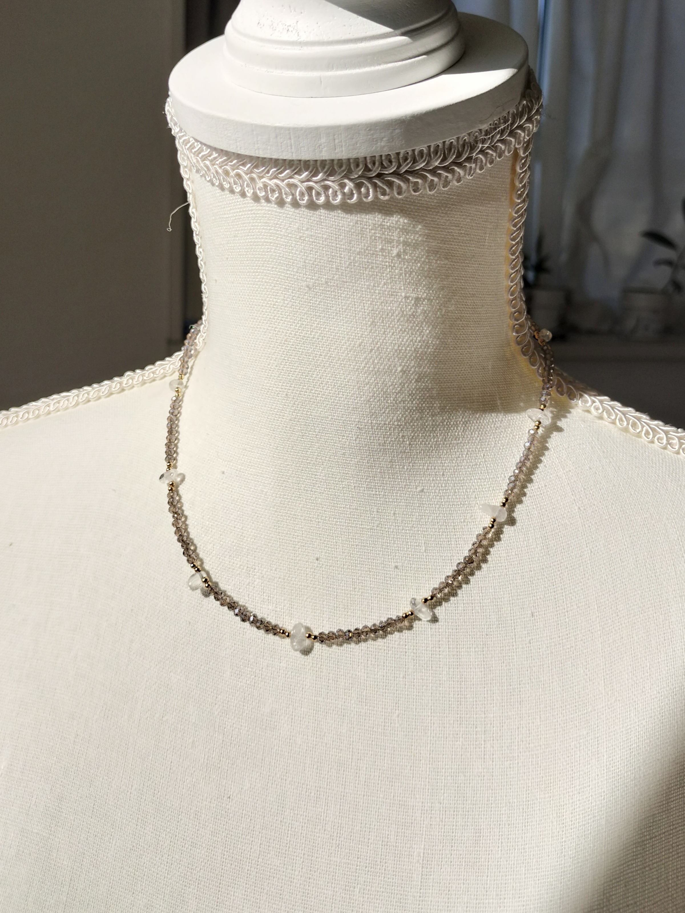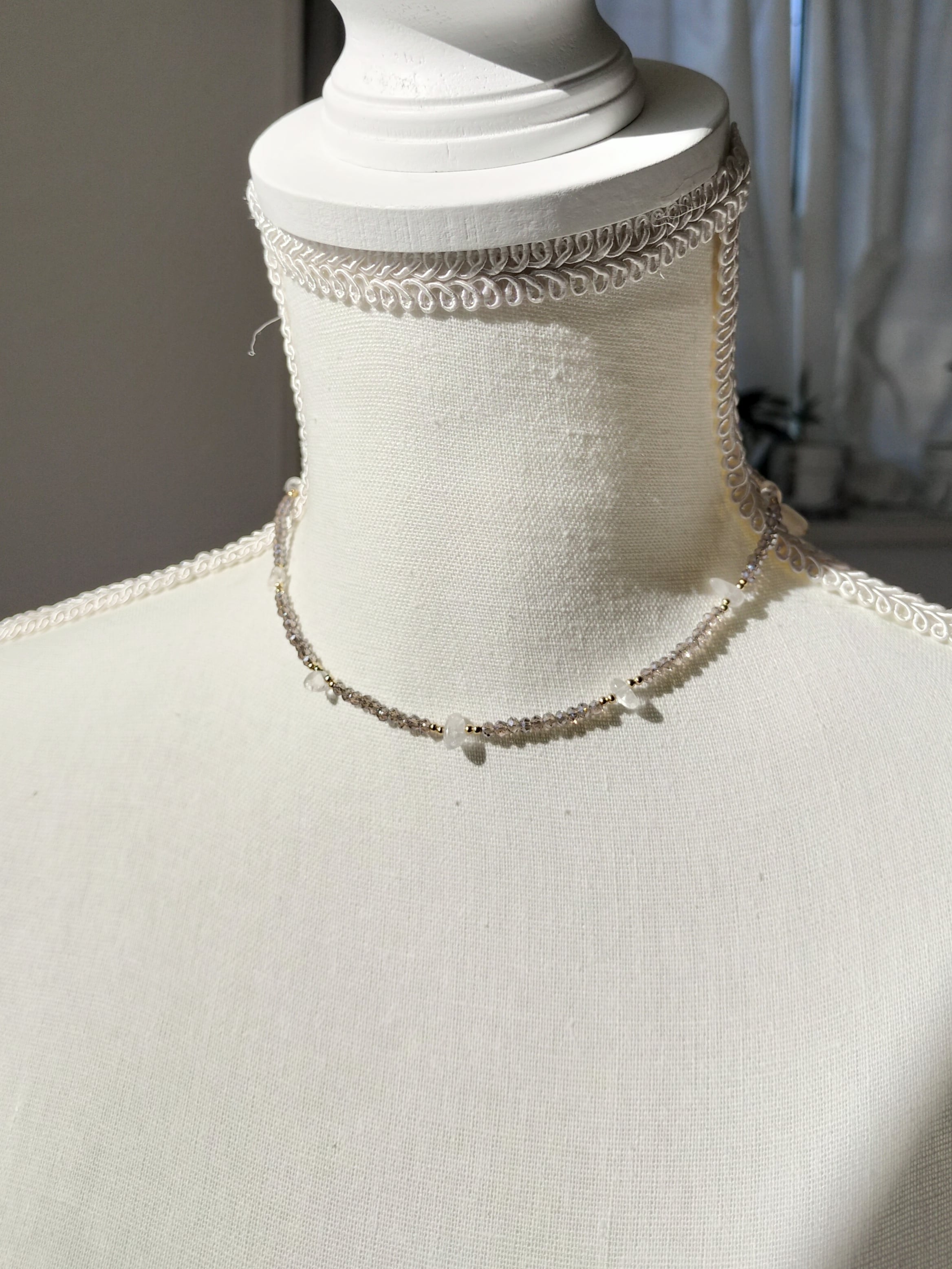 今回はコスメフロアを見ている女性をイメージして、きらめきや艶感、女性らしいラインを引き立てるショートネックレスを制作しました。