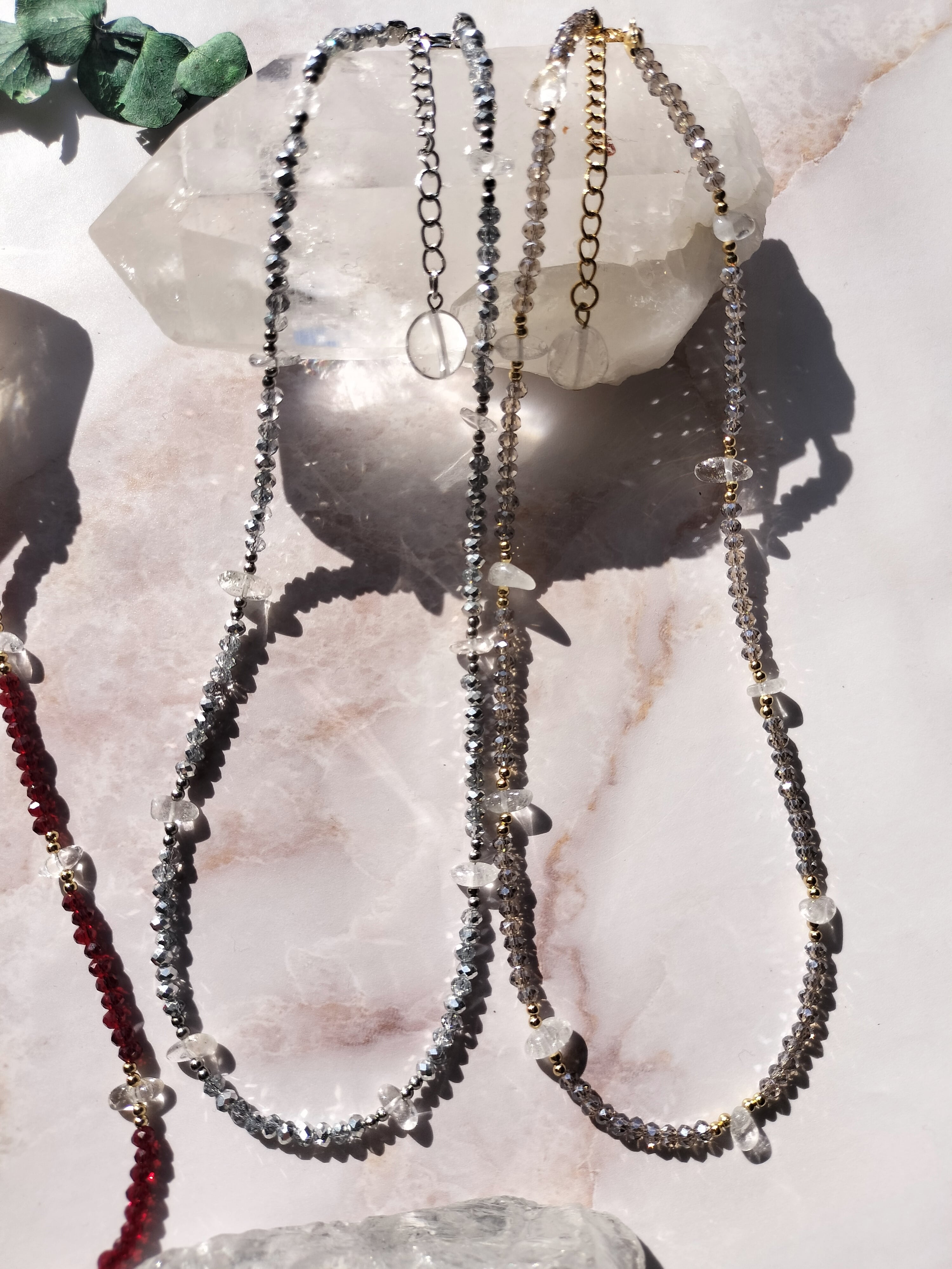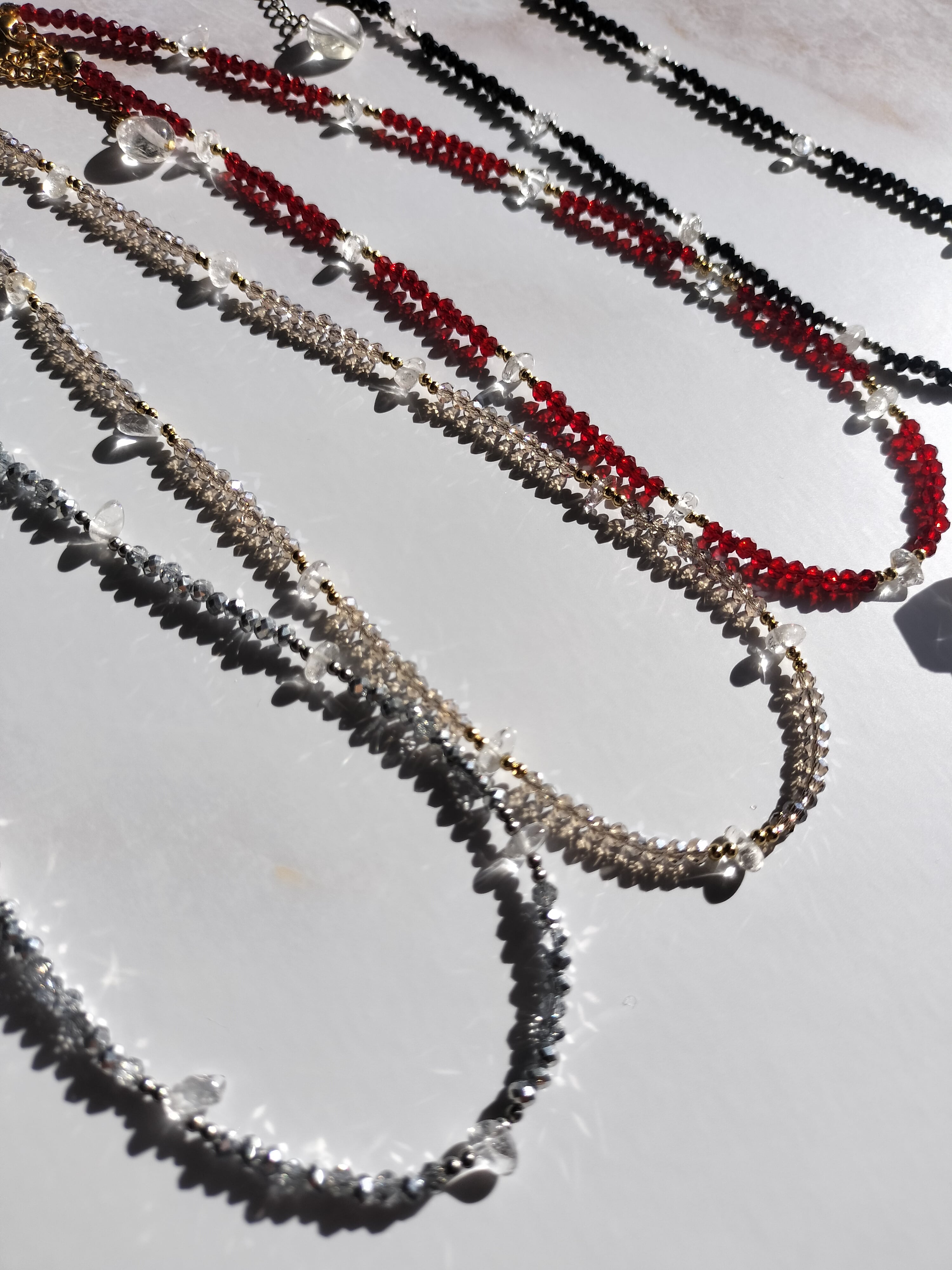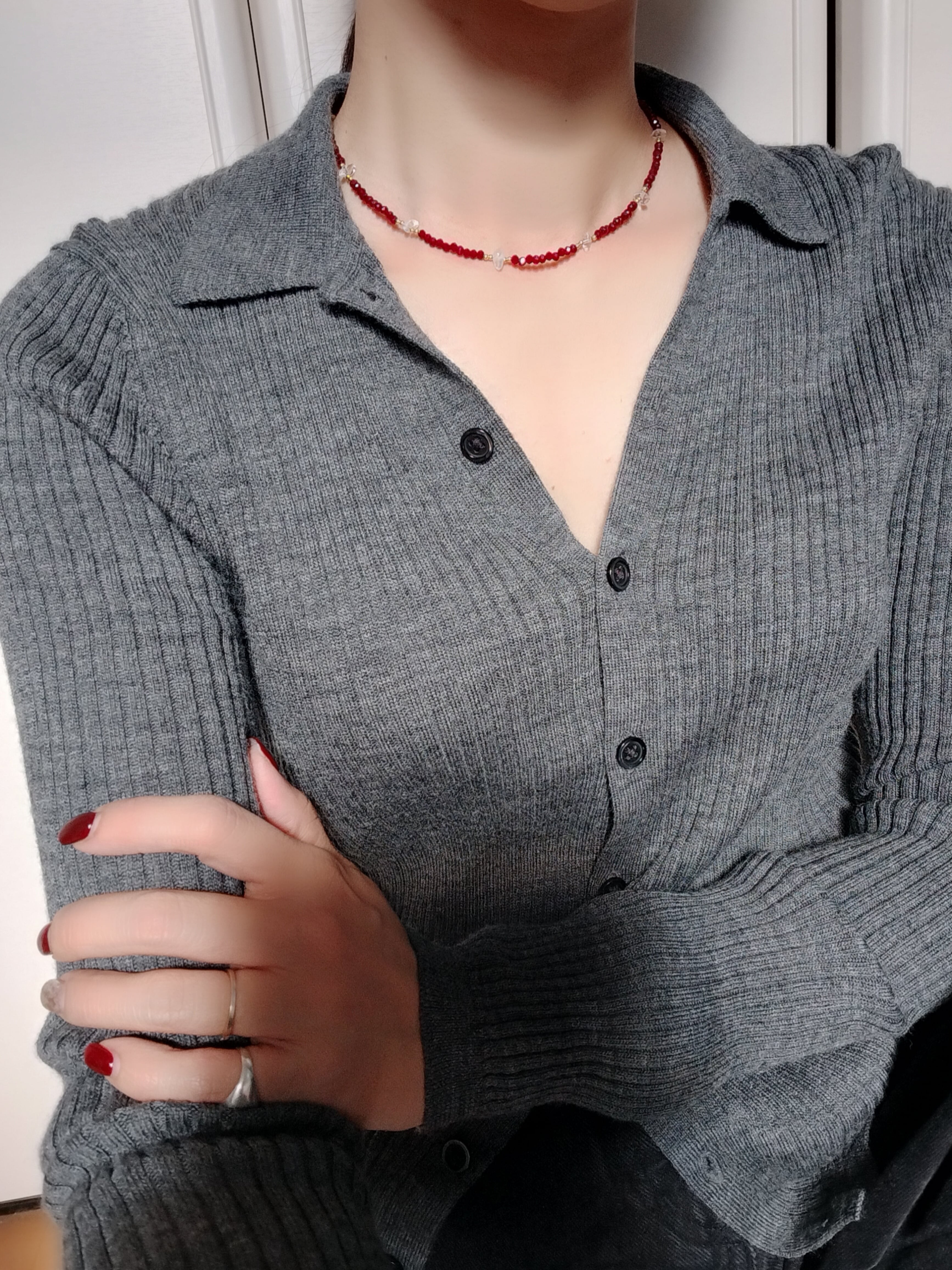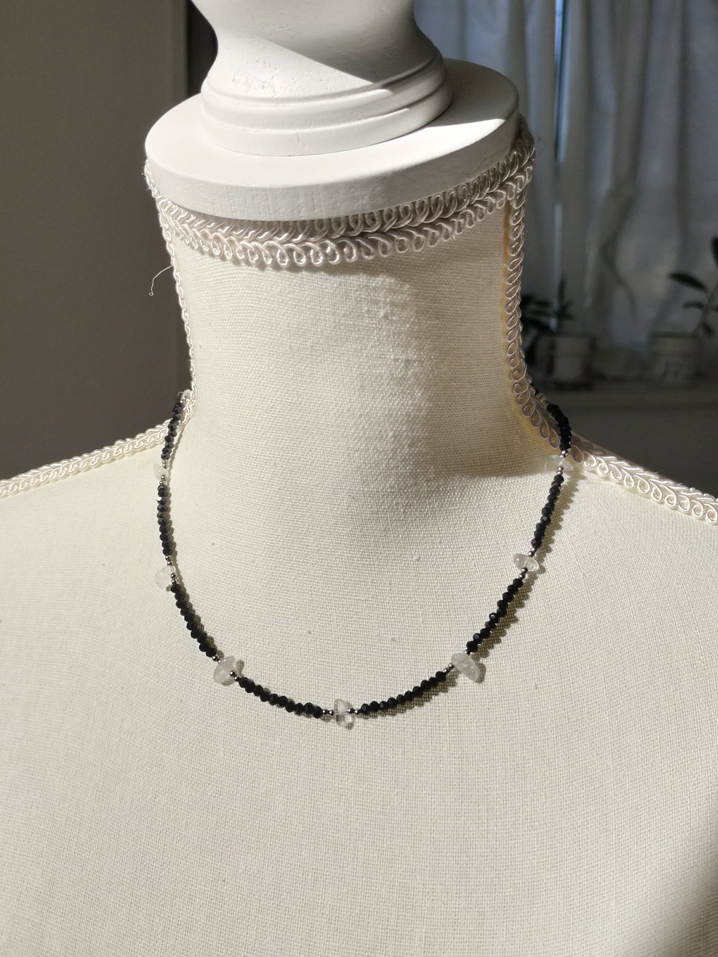 今回はコスメフロアを見ている女性をイメージして、きらめきや艶感、女性らしいラインを引き立てるショートネックレスを制作しました。