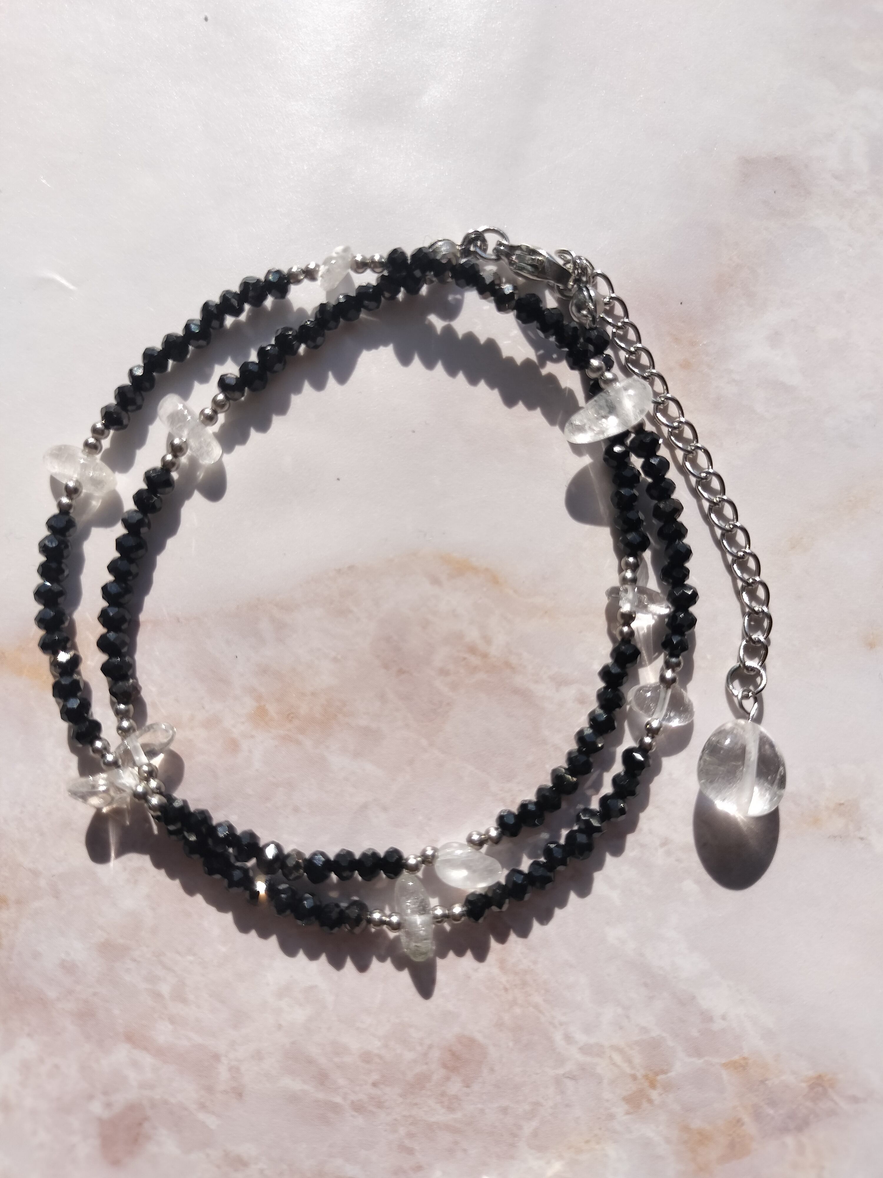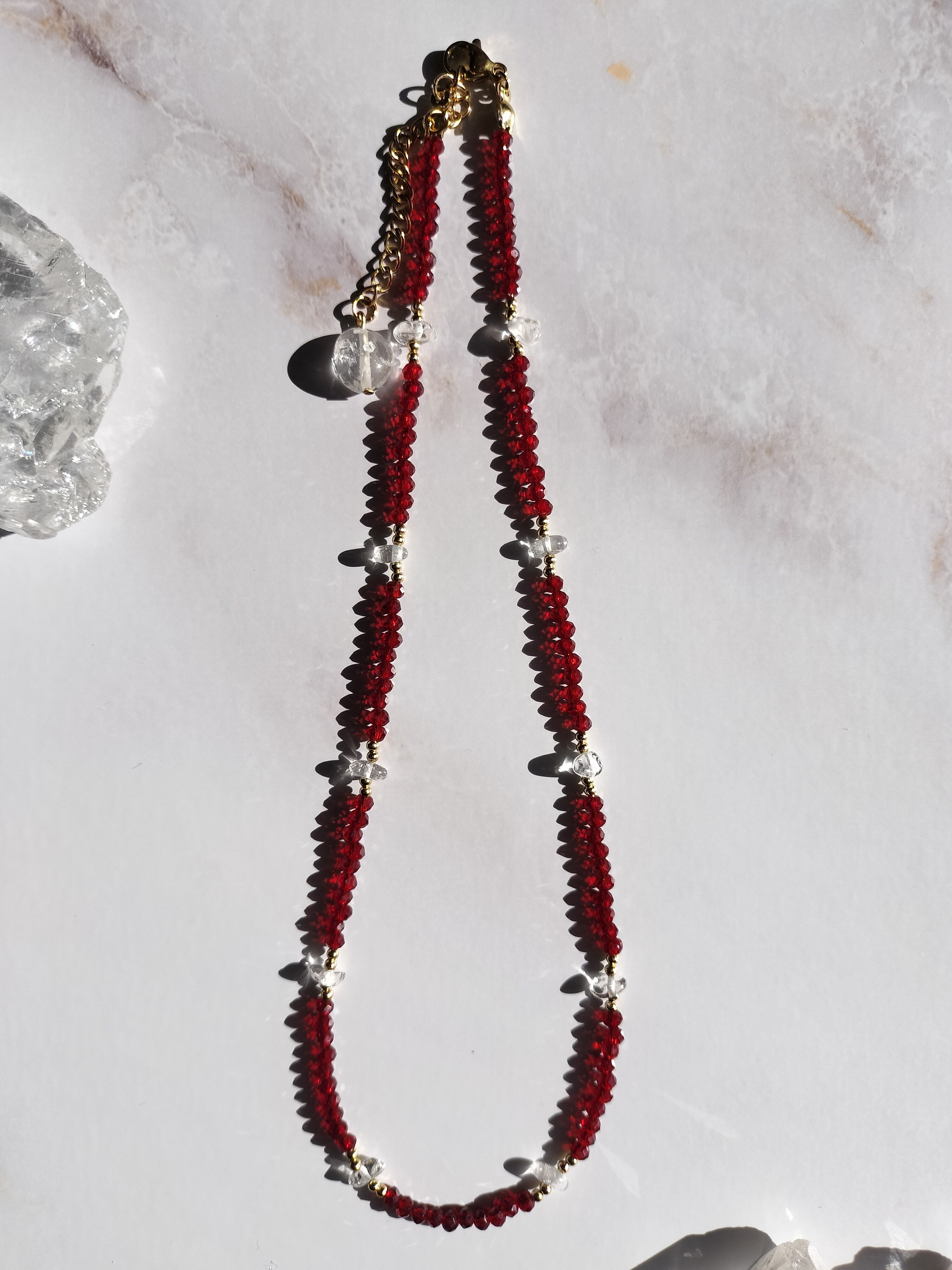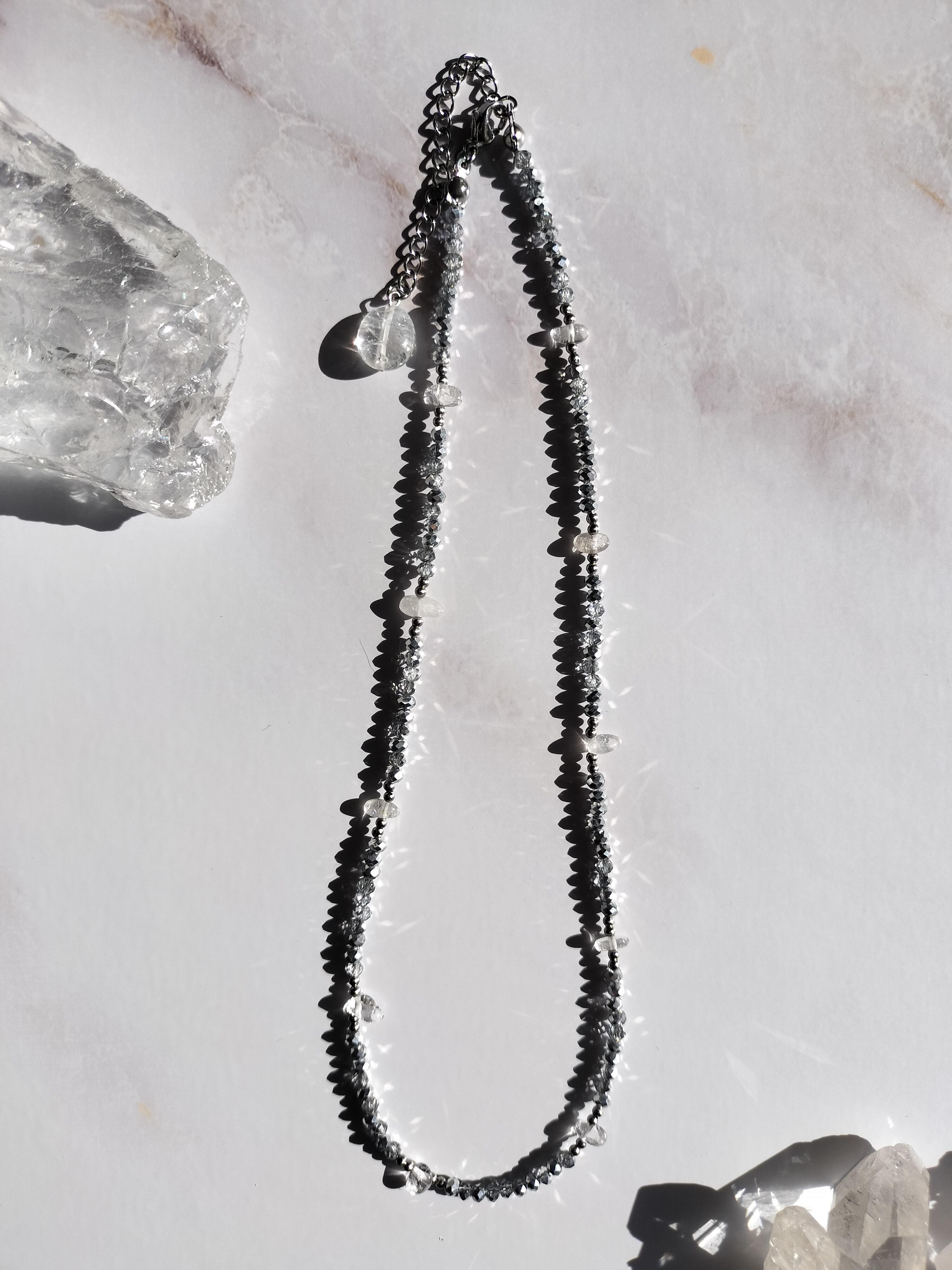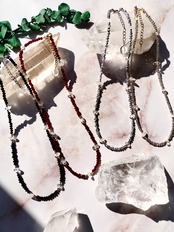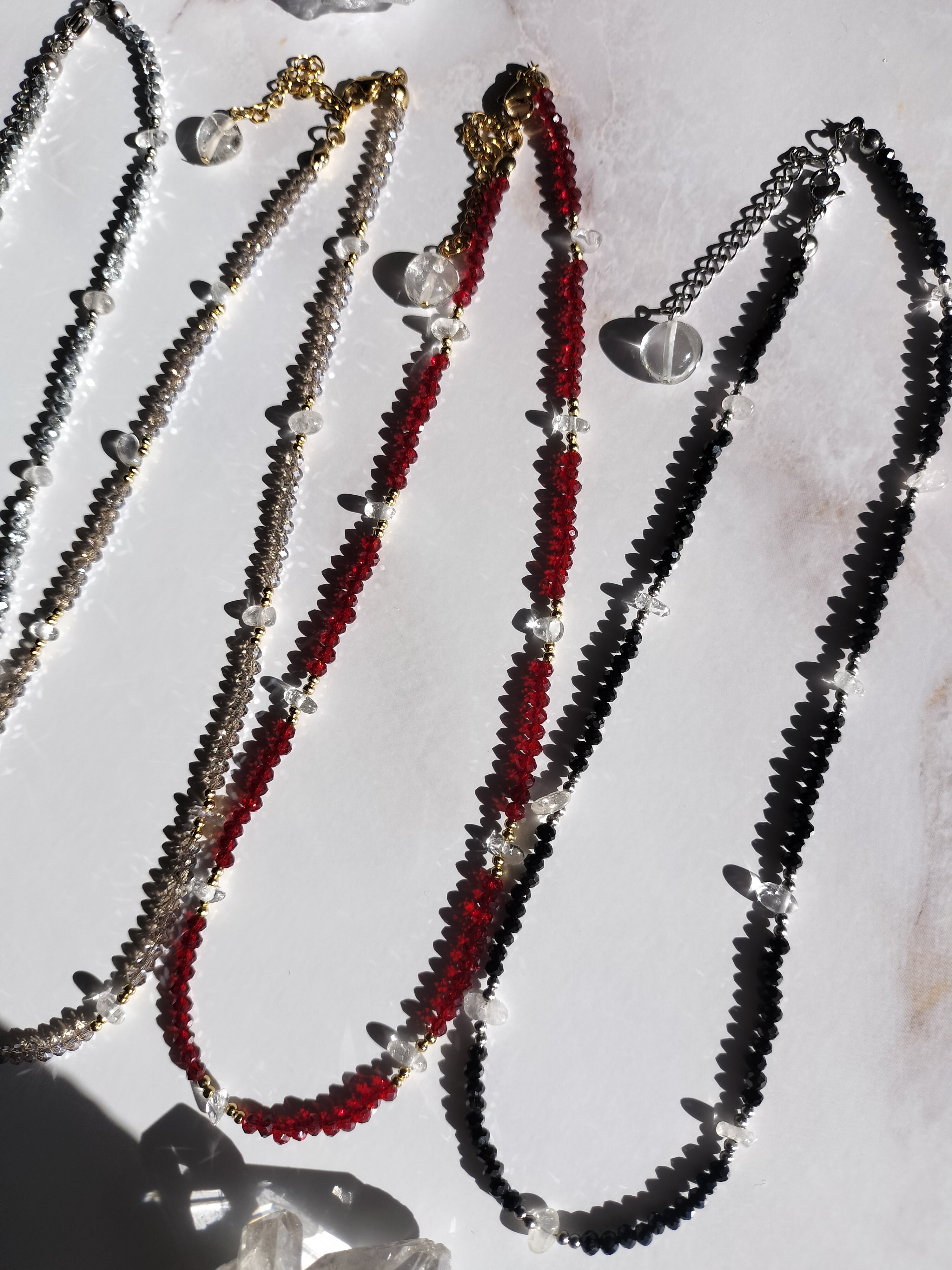 今回はコスメフロアを見ている女性をイメージして、きらめきや艶感、女性らしいラインを引き立てるショートネックレスを制作しました。